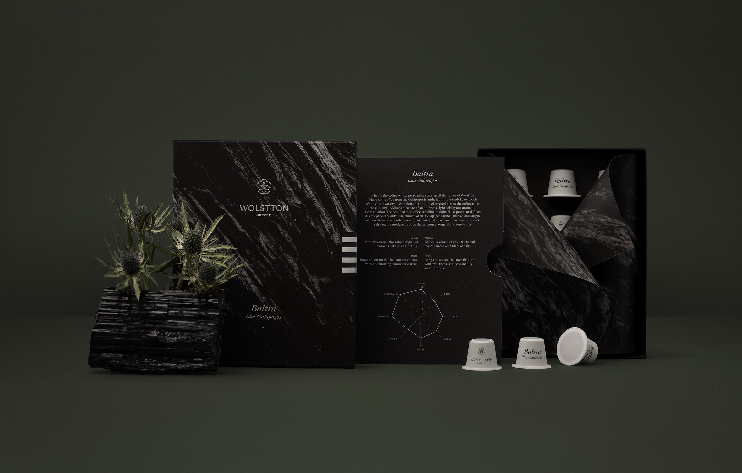 Blend composed of speciality coffee from the Galapagos Islands with a delicate touch of the Gesha variety. Baltra sums up all the values of the Wolstton brand.
